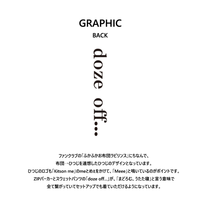 【ユニセックスサイズ】 S■総丈96cm,ウエスト72~80cm,股下73cm M■総丈100cm,ウエスト76~84cm,股下75cm L■総丈104cm,ウエスト79~87cm,股下76cm XL■総丈108cm,ウエスト82~90cm,股下78cm XXL■総丈110cm,ウエスト85~93cm,股下80cm ★撮影時に松田るかさん着用サイズは 全色【ユニセックス:XXL】サイズです。 ★メンズモデル着用サイズは OATMEAL,A.GREEN【ユニセックス:S】サイズ BLACK,WINE,NAVY【ユニセックス:M】サイズです。 メンズモデル身長:177cm 松田るかさんを迎えたKitson me コラボレーション企画始動! 今回は半袖Tシャツ、ZIPパーカー、スウェットパンツをご用意! 【デザイン】 ファンクラブの「ふかふかお布団ラビリンス」にちなんで、 布団→ひつじを連想したひつじのデザインとなっています。 ひつじのロゴも「Kitson me」のmeとめぇをかけて、「Meee」と鳴いているのがポイントです。 ZIPパーカーとスウェットパンツの「doze off...」が、「まどろむ、うたた寝」と言う意味で 全て繋がっていてセットアップでも着ていただけるようになっています。 ここでしか手に入らない受注期間限定アイテムです!是非お買い求めください!!! ※商品の発送予定時期は 【12月上旬頃~12月中旬頃順次発送予定】となります。 ※BLACKのXLサイズは生産資材確保の都合上 【2月中旬頃~2月下旬頃順次発送予定】となります。 ※受注生産の為、発送予定時期が前後する場合がございます。 ※高額注文の場合には ご注文後にお電話にてご連絡をさせていただく場合がございます。 お電話にてご連絡が取れない場合にはメールにてご連絡させていただき、 ご連絡日より3日以内にご返信をいただけない場合には不正注文の可能性があると判断し トラブル防止のためご注文をキャンセルとさせていただきます。 ※商品によっては撮影時にサンプルを使用しているため若干仕様が異なる場合がございます。 また、サイズ・カラーによっては仕様が異なる場合もございます。 ※手作業で縫製をしているため縫製の仕様により、 個体差が生じてしまいますので、1~2cm程度の誤差は予めご了承くださいませ。 ※洗濯機を使用した場合、お届け時のサイズより多少縮む場合がございます。 洗濯機を使用する場合は裏返してネットに入れることを推奨しております。 また、タンブラー乾燥機を使用しますとプリントが剥がれる恐れがありますので 避けていただきますようお願いいたします。 また、洗濯時の液温は40度以下とし、 塩素系および酸素系漂白剤の使用は避けていただきますようお願いいたします。 アイロンにつきましてもプリント及び刺繍部分は避け、 生地部分にアイロンをかける場合にはあて布をして110度(低温)にてお願いいたします。 ※また、受注生産とさせていただいておりますが、 各色・サイズ毎に生産数に限りがございます為、 生産数の上限に達しました場合在庫切れとなる場合がございます。 |