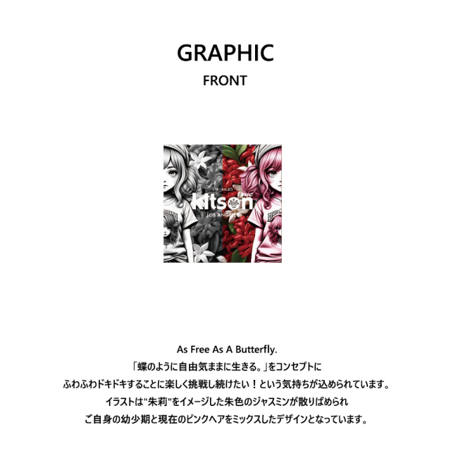| 商品Data | 三桜じゅりさんを迎えたKitson me コラボレーション企画! 今回は半袖Tシャツ、ZIPパーカー、バケットハットをご用意! 【デザイン】 As Free As A Butterfly. 「蝶のように自由気ままに生きる。」 ふわふわドキドキすることに楽しく挑戦し続けたい!という気持ちが詰まっています。 出会ってくれたみんなが「笑顔」でいてくれることを願ってこのテーマにしました。 イラストは"朱莉"をイメージして朱色のジャスミンが散りばめられた背景に 子供の頃の私と今のピンクヘアの私をミックスして制作しました。 ここでしか手に入らない受注期間限定アイテムです!是非お買い求めください!!! ※商品の発送予定時期は 【9月上旬頃~9月中旬頃順次発送予定】となります。 ※受注生産の為、発送予定時期が前後する場合がございます。 ※高額注文の場合には ご注文後にお電話にてご連絡をさせていただく場合がございます。 お電話にてご連絡が取れない場合にはメールにてご連絡させていただき、 ご連絡日より3日以内にご返信をいただけない場合には不正注文の可能性があると判断し トラブル防止のためご注文をキャンセルとさせていただきます。 ※商品によっては撮影時にサンプルを使用しているため若干仕様が異なる場合がございます。 また、サイズ・カラーによっては仕様が異なる場合もございます。 ※手作業で縫製をしているため縫製の仕様により、 個体差が生じてしまいますので、1~2cm程度の誤差は予めご了承くださいませ。 ※洗濯機を使用した場合、お届け時のサイズより多少縮む場合がございます。 洗濯機を使用する場合は裏返してネットに入れることを推奨しております。 また、タンブラー乾燥機を使用しますとプリントが剥がれる恐れがありますので 避けていただきますようお願いいたします。 また、洗濯時の液温は40度以下とし、 塩素系および酸素系漂白剤の使用は避けていただきますようお願いいたします。 アイロンにつきましてもプリント及び刺繍部分は避け、 生地部分にアイロンをかける場合にはあて布をして110度(低温)にてお願いいたします。 ※また、受注生産とさせていただいておりますが、 各色・サイズ毎に生産数に限りがございます為、 生産数の上限に達しました場合在庫切れとなる場合がございます。 |