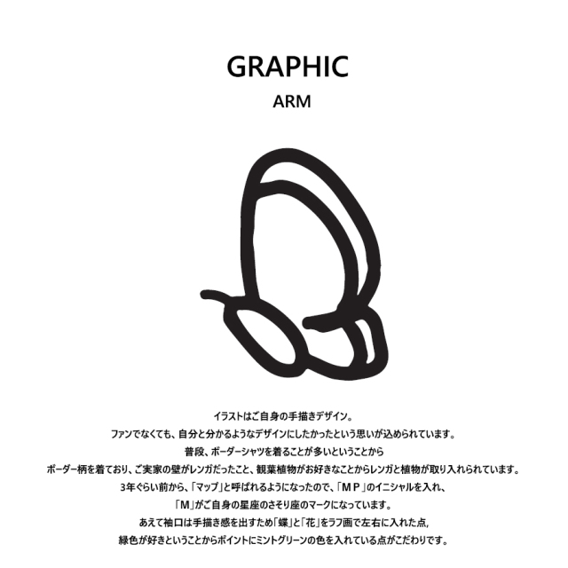 今牧輝琉さんを迎えたKitson me コラボレーション企画! 今回はプルオーバーパーカーと長袖Tシャツ、ジョガーパンツをご用意! 【デザイン】 イラストはご自身の手描きデザイン。 ファンでなくても、自分と分かるようなデザインにしたかったという思いが込められています。 普段、ボーダーシャツを着ることが多いということから ボーダー柄を着ており、ご実家の壁がレンガだったこと、観葉植物がお好きなことからレンガと植物が取り入れられています。 3年ぐらい前から、「マップ」と呼ばれるようになったので、「MP」のイニシャルを入れ、 「M」がご自身の星座のさそり座のマークになっています。 あえて袖口は手描き感を出すため「蝶」と「花」をラフ画で左右に入れた点, 緑色が好きということからポイントにミントグリーンの色を入れている点がこだわりです。 ここでしか手に入らない受注期間限定アイテムです!是非お買い求めください!!! ※商品の発送予定時期は【10月中旬頃~10月下旬頃順次発送予定】となります。 ※受注生産の為、発送予定時期が前後する場合がございます。 ※高額注文の場合には ご注文後にお電話にてご連絡をさせていただく場合がございます。 お電話にてご連絡が取れない場合にはメールにてご連絡させていただき、 ご連絡日より3日以内にご返信をいただけない場合には不正注文の可能性があると判断し トラブル防止のためご注文をキャンセルとさせていただきます。 ※商品によっては撮影時にサンプルを使用しているため若干仕様が異なる場合がございます。 また、サイズ・カラーによっては仕様が異なる場合もございます。 ※手作業で縫製をしているため縫製の仕様により、 個体差が生じてしまいますので、1~2cm程度の誤差は予めご了承くださいませ。 ※洗濯機を使用した場合、お届け時のサイズより多少縮む場合がございます。 洗濯機を使用する場合は裏返してネットに入れることを推奨しております。 また、タンブラー乾燥機を使用しますとプリントが剥がれる恐れがありますので 避けていただきますようお願いいたします。 また、洗濯時の液温は40度以下とし、 塩素系および酸素系漂白剤の使用は避けていただきますようお願いいたします。 アイロンにつきましてもプリント及び刺繍部分は避け、 生地部分にアイロンをかける場合にはあて布をして110度(低温)にてお願いいたします。 ※また、受注生産とさせていただいておりますが、 各色・サイズ毎に生産数に限りがございます為、 生産数の上限に達しました場合在庫切れとなる場合がございます。 |