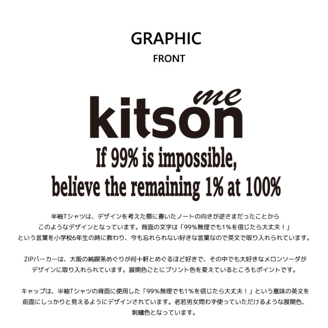| 商品Data | 八木美樹さんを迎えたKitson me コラボレーション企画! 今回はZIPパーカー、半袖Tシャツ、キャップをご用意! 【デザイン】 半袖Tシャツは、デザインを考えた際に書いたノートの向きが逆さまだったことから このようなデザインとなっています。 背面の文字は「99%無理でも1%を信じたら大丈夫!」という言葉を小学校6年生の時に教わり、 今も忘れられない好きな言葉なので英文で取り入れられています。 ZIPパーカーは、大阪の純喫茶めぐりが何十軒とめぐるほど好きで、その中でも大好きなメロンソーダが デザインに取り入れられています。 展開色ごとにプリント色を変えているところもポイントです。 キャップは、半袖Tシャツの背面に使用した「99%無理でも1%を信じたら大丈夫!」という意味の英文を前面にしっかりと見えるようにデザインされています。 老若男女問わず使っていただけるような展開色、刺繍色となっています。 ※商品の発送予定時期は 【12月中旬頃~12月下旬頃順次発送予定】となります。 ※受注生産の為、発送予定時期が前後する場合がございます。 ※高額注文の場合には ご注文後にお電話にてご連絡をさせていただく場合がございます。 お電話にてご連絡が取れない場合にはメールにてご連絡させていただき、 ご連絡日より3日以内にご返信をいただけない場合には不正注文の可能性があると判断し トラブル防止のためご注文をキャンセルとさせていただきます。 ※商品によっては撮影時にサンプルを使用しているため若干仕様が異なる場合がございます。 また、サイズ・カラーによっては仕様が異なる場合もございます。 ※手作業で縫製をしているため縫製の仕様により、 個体差が生じてしまいますので、1~2cm程度の誤差は予めご了承くださいませ。 ※洗濯機を使用した場合、お届け時のサイズより多少縮む場合がございます。 洗濯機を使用する場合は裏返してネットに入れることを推奨しております。 また、タンブラー乾燥機を使用しますとプリントが剥がれる恐れがありますので 避けていただきますようお願いいたします。 また、洗濯時の液温は40度以下とし、 塩素系および酸素系漂白剤の使用は避けていただきますようお願いいたします。 アイロンにつきましてもプリント及び刺繍部分は避け、 生地部分にアイロンをかける場合にはあて布をして110度(低温)にてお願いいたします。 ※また、受注生産とさせていただいておりますが、 各色・サイズ毎に生産数に限りがございます為、 生産数の上限に達しました場合在庫切れとなる場合がございます。 |