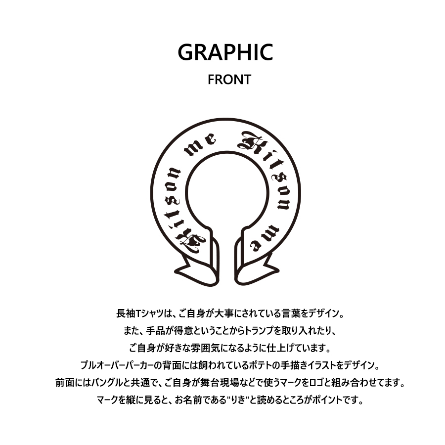 谷水力さんを迎えたKitson me コラボレーション企画! 今回は長袖Tシャツ、プルオーバーパーカー、バングルをご用意! 【デザイン】 長袖Tシャツは、ご自身が大事にされている言葉をデザイン。 また、手品が得意ということからトランプを取り入れたり、ご自身が好きな雰囲気になるように仕上げています。 プルオーバーパーカーの背面には飼われているポテトの手描きイラストをデザイン。 前面にはバングルと共通で、ご自身が舞台現場などで使うマークをロゴと組み合わせてます。 マークを縦に見ると、お名前である"りき"と読めるところがポイントです。 ここでしか手に入らない受注期間限定アイテムです!是非お買い求めください!!! ※商品の発送予定時期は 【1月中旬頃〜2月上旬頃順次発送】となります。 ※受注生産の為、発送予定時期が前後する場合がございます。 ※高額注文の場合には ご注文後にお電話にてご連絡をさせていただく場合がございます。 お電話にてご連絡が取れない場合にはメールにてご連絡させていただき、 ご連絡日より3日以内にご返信をいただけない場合には不正注文の可能性があると判断し トラブル防止のためご注文をキャンセルとさせていただきます。 ※商品によっては撮影時にサンプルを使用しているため若干仕様が異なる場合がございます。 また、サイズ・カラーによっては仕様が異なる場合もございます。 ※手作業で縫製をしているため縫製の仕様により、 個体差が生じてしまいますので、1~2cm程度の誤差は予めご了承くださいませ。 ※洗濯機を使用した場合、お届け時のサイズより多少縮む場合がございます。 洗濯機を使用する場合は裏返してネットに入れることを推奨しております。 また、タンブラー乾燥機を使用しますとプリントが剥がれる恐れがありますので 避けていただきますようお願いいたします。 また、洗濯時の液温は40度以下とし、 塩素系および酸素系漂白剤の使用は避けていただきますようお願いいたします。 アイロンにつきましてもプリント及び刺繍部分は避け、 生地部分にアイロンをかける場合にはあて布をして110度(低温)にてお願いいたします。 ※また、受注生産とさせていただいておりますが、 各色・サイズ毎に生産数に限りがございます為、 生産数の上限に達しました場合在庫切れとなる場合がございます。 |