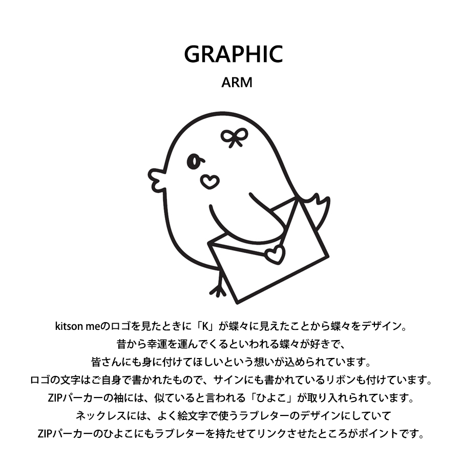 高橋妃那さんとのコラボ企画! 今回のコラボは半袖Tシャツ、ZIPパーカー、ネックレスをリリース。 【デザイン】 kitson meのロゴを見たときに「K」が蝶々に見えたことから蝶々をデザイン。 昔から幸運を運んでくるといわれる蝶々が好きで、 皆さんにも身に付けてほしいという想いが込められています。 ロゴの文字はご自身で書かれたもので、サインにも書かれているリボンも付けています。 ZIPパーカーの袖には、似ていると言われる「ひよこ」が取り入れられています。 ネックレスには、よく絵文字で使うラブレターのデザインにしていて ZIPパーカーのひよこにもラブレターを持たせてリンクさせたところがポイントです。 ※現時点での商品の発送予定時期は 【4月上旬頃~4月中旬頃順次発送】 を予定しております。 尚、工場の生産の都合上、お客様のご入金・決済のタイミングにより前後する場合がございます。 予めご了承ください。 ※商品代金が10万円以上にて代引き決済を利用してのご注文につきましては、 トラブル防止のため、決済方法をクレジットカード決済もしくはコンビニ決済に変更 させていただく場合がございます。変更前にお電話、メールにてご連絡をさせていただきます。 ※商品によっては撮影時にサンプルを使用しているため若干仕様が異なる場合がございます。 また、サイズ・カラーによっては仕様が異なる場合もございます。 ※手作業で縫製をしているため縫製の仕様により、 個体差が生じてしまいますので、1~2cm程度の誤差は予めご了承くださいませ。 ※洗濯機を使用した場合、お届け時のサイズより多少縮む場合がございます。 また、乾燥機の使用は避けていただきますようお願いいたします。 ※また、受注生産とさせていただいておりますが、 各色・サイズ毎に生産数に限りがございます為、 生産数の上限に達しました場合在庫切れとなる場合がございます。 |