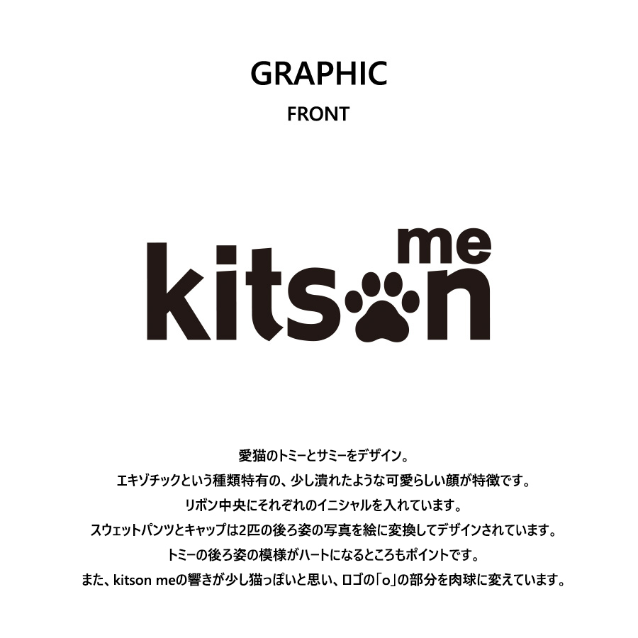碓井将大さんとのコラボ企画! 今回のコラボはトレーナー、スウェットパンツ、キャップをリリース。 【デザイン】 愛猫のトミーとサミーをデザイン。 エキゾチックという種類特有の、少し潰れたような可愛らしい顔が特徴です。 リボン中央にそれぞれのイニシャルを入れています。 スウェットパンツとキャップは2匹の後ろ姿の写真を絵に変換してデザインされています。 トミーの後ろ姿の模様がハートになるところもポイントです。 また、kitson meの響きが少し猫っぽいと思い、ロゴの「o」の部分を肉球に変えています。 ここでしか手に入らない受注期間限定アイテムです!是非お買い求めください!!! ※商品の発送予定時期は【5月下旬頃〜6月上旬頃順次発送予定】 となります。 ※受注生産の為、発送予定時期が前後する場合がございます。 ※高額注文の場合には ご注文後にお電話にてご連絡をさせていただく場合がございます。 お電話にてご連絡が取れない場合にはメールにてご連絡させていただき、 ご連絡日より3日以内にご返信をいただけない場合には不正注文の可能性があると判断し トラブル防止のためご注文をキャンセルとさせていただきます。 ※商品によっては撮影時にサンプルを使用しているため若干仕様が異なる場合がございます。 また、サイズ・カラーによっては仕様が異なる場合もございます。 ※手作業で縫製をしているため縫製の仕様により、 個体差が生じてしまいますので、1~2cm程度の誤差は予めご了承くださいませ。 ※洗濯機を使用した場合、お届け時のサイズより多少縮む場合がございます。 洗濯機を使用する場合は裏返してネットに入れることを推奨しております。 また、タンブラー乾燥機を使用しますとプリントが剥がれる恐れがありますので 避けていただきますようお願いいたします。 また、洗濯時の液温は40度以下とし、 塩素系および酸素系漂白剤の使用は避けていただきますようお願いいたします。 アイロンにつきましてもプリント及び刺繍部分は避け、 生地部分にアイロンをかける場合にはあて布をして110度(低温)にてお願いいたします。 ※また、受注生産とさせていただいておりますが、 各色・サイズ毎に生産数に限りがございます為、 生産数の上限に達しました場合在庫切れとなる場合がございます。 |